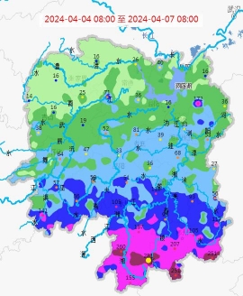 清明假期,全省普降小到大雨,湘南局地降下大暴雨。4日8时至7日8时,全省平均降雨量为43.9毫米,最大为永州市124.9毫米,郴州市119.3毫米,衡阳市47.3毫米次之。点最大降雨为永州市蓝山县塔峰镇排田村280.5毫米,其次为永州市宁远县九嶷山瑶族乡九嶷(二)270.0毫米,永州市蓝山县所城镇丘家266.5毫米。共57县1136站降雨超过50毫米。