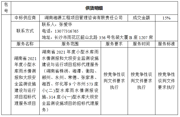 湖南省水文水资源勘测中心的湖南省2021年度小型水库雨水情测报和大坝安全监测设施建设与运行项目招标代理服务公开竞争性谈判招标采购项目于2022年3月8日结束,现将中标(成交)结果公告如下:
