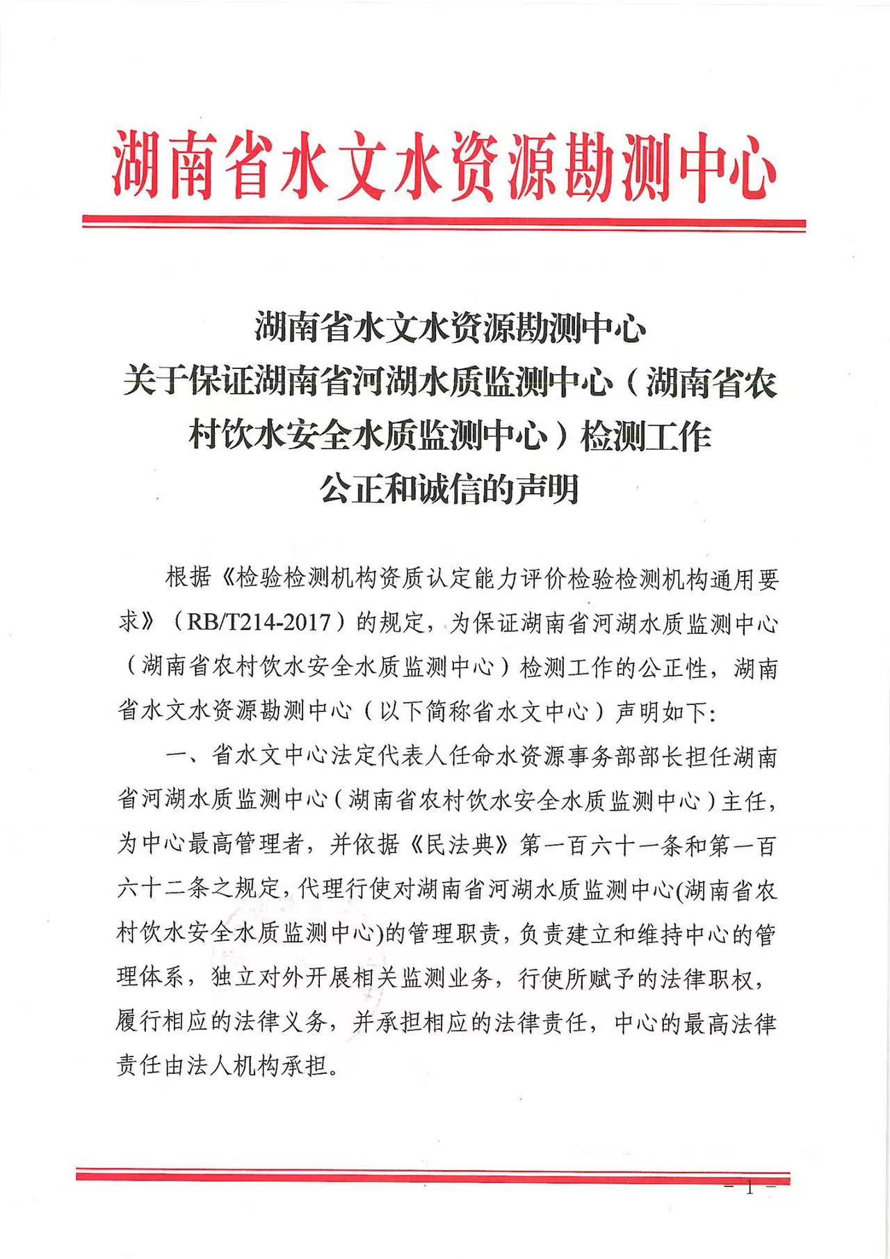 湖南省水文水资源勘测中心关于保证湖南省河湖水质监测中心( 湖南省农村饮水安全水质监测中心)检测工作公正和诚信的声明