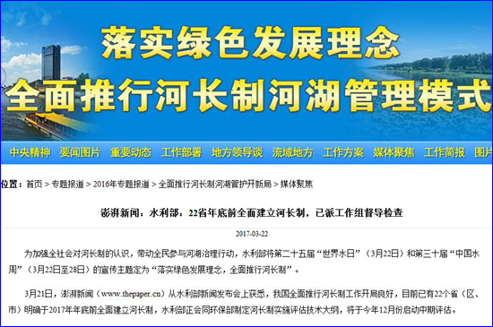 媒体聚焦河长制 澎湃新闻:水利部:22省年底前全面建立河长制,已派工作组督导检查