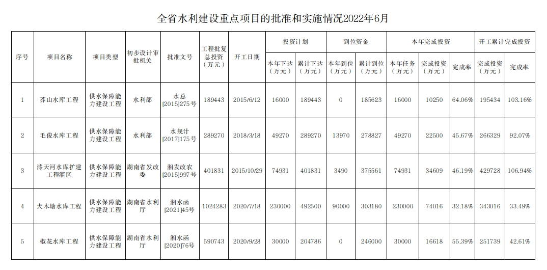全省水利建设重点项目的批准和实施情况2022年6月