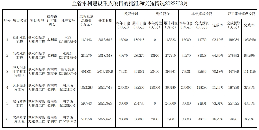 全省水利建设重点项目的批准和实施情况2022年8月
