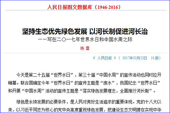 陈雷在《人民日报》署名文章:坚持生态优先绿色发展 以河长制促进河长治