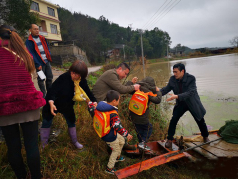 潇水湾村线口片洪涝严重,进出的道路被淹,运送幼儿园小朋友的校车没法通行,镇村干部在充分保障安全的情况下,用小船分批次将孩子送到对岸,并护送到家中。