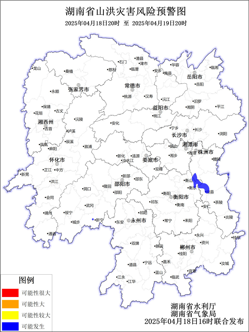 根据省气象局4月18日预报,省水利厅与省气象局联合会商得出如下结论:受降雨影响,18日20:00至19日20:00,株洲市东北部、西北部,衡阳市东北部、西部,邵阳市西南部等局地可能发生山洪灾害。
