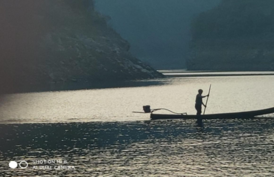 在潭波河交汇段发现一名正在作业的渔民
