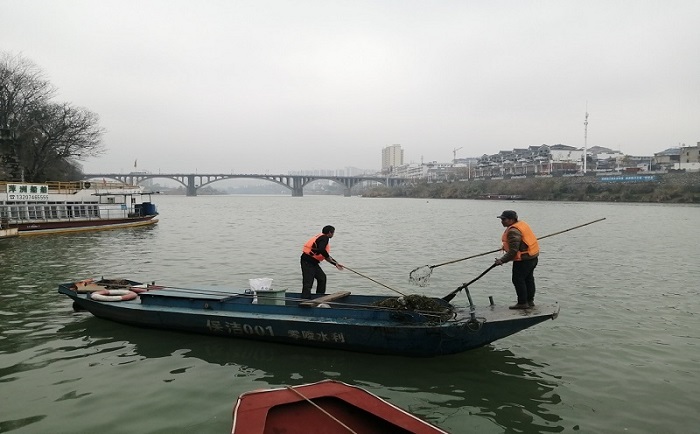 零陵区全面落实河长制工作以来,按照“把河道当街道管理、把库区当景区保护”工作思路,将河道水库保洁工作纳入城乡一体化环境整治,就像城市里的“美容师”——环卫工人一样,潇水河上有这样一群河道“美容师”,他们会开船、会游泳、会打捞、会撒网,十八般武艺样样精通。每天早出晚归,在潇水河零陵城区段17.5公里的河道上打捞水草和杂物,保持河道的干净、整洁,呈现出潇水河上的一道“靓丽风景线”。